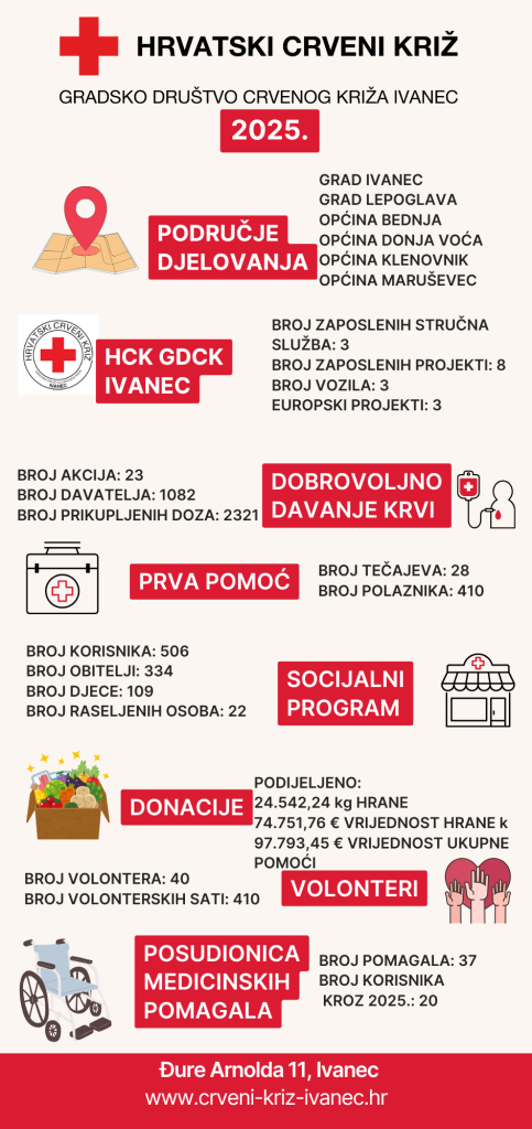 U 2025. godini Gradsko društvo Crvenog križa Ivanec nastavilo je pomagati onima kojima je pomoć najpotrebnija – kroz brojne akcije, programe i volonterski rad.
